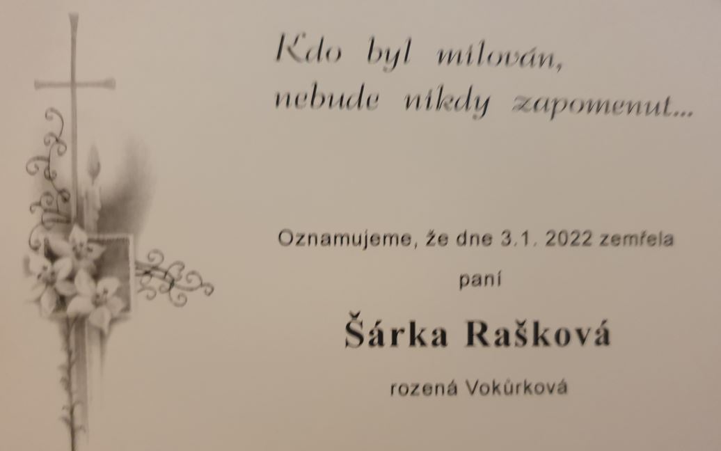 Ve středu 12. ledna 2022 bude od 15.00 hodin odsloužena zádušní mše za zesnulou Šárku Raškovou v místním kostele.